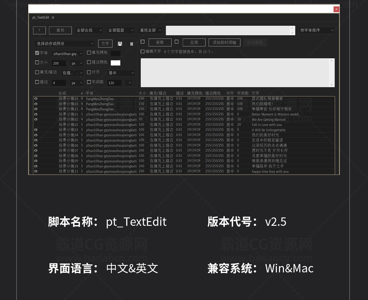 AE脚本: 批量替换编辑文字图层样式属性字体pt_TextEdit_v2.5 中英文版