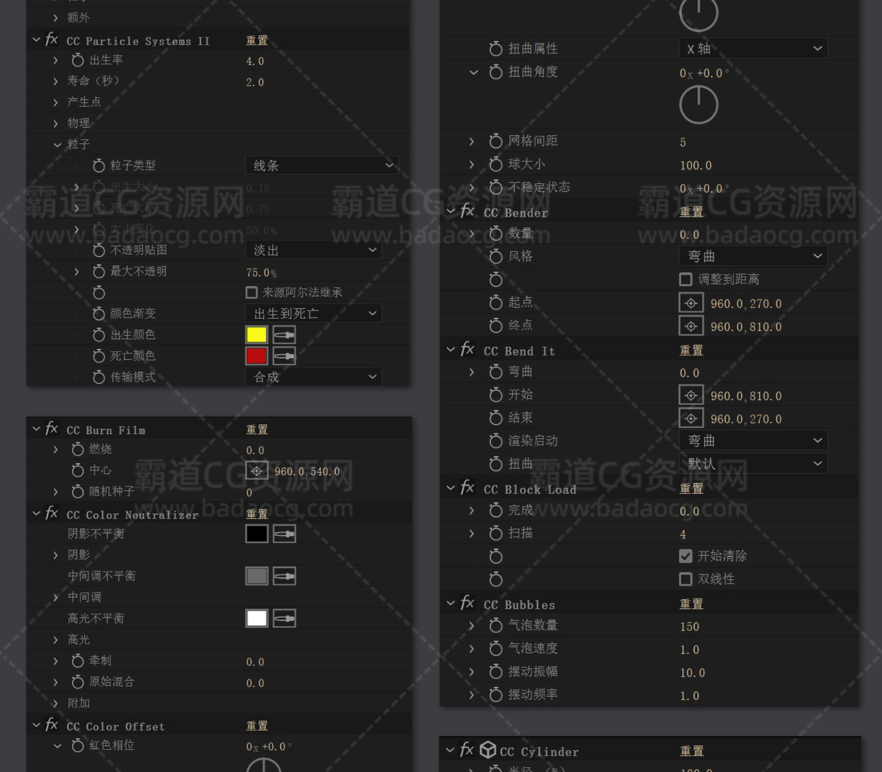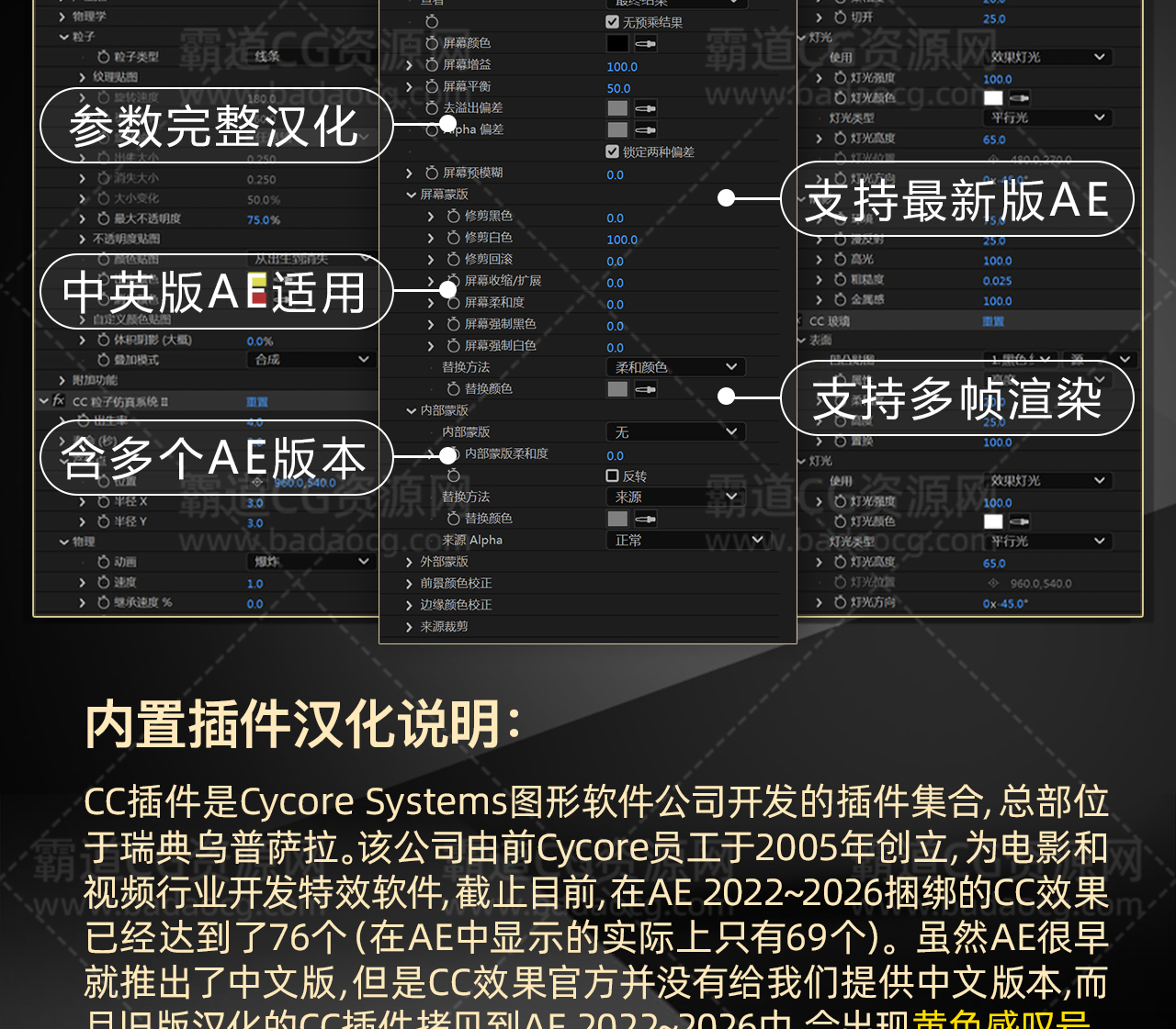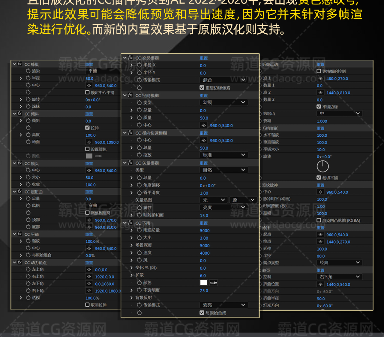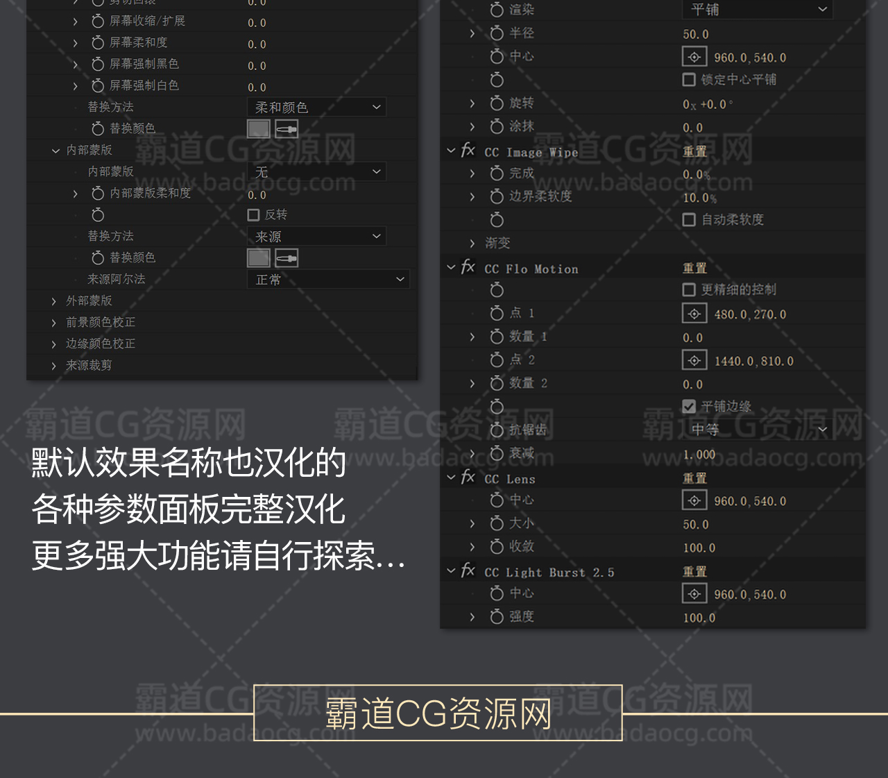 AE 2022~2024内置CC插件汉化,均包含效果名称+参数汉化版 和 仅参数汉化/效果名称不汉化版 两种,供用户自行按需选择。